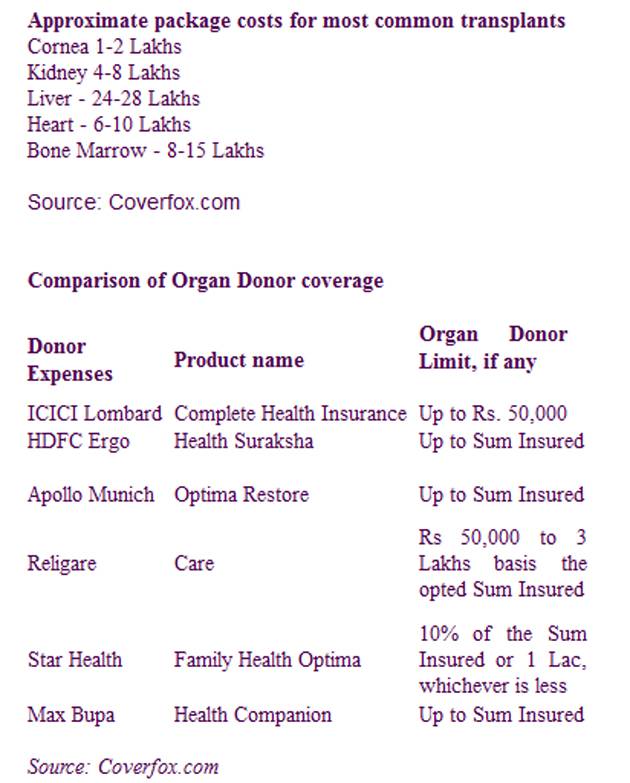 Exorbitant costs of organ transplant make an adequate health insurance cover - and a critical illness cover, too, budget permitting - simply indispensable. Most general insurers today cover organ transplant surgeries as part of their regular policies. They also cover the organ donor’s expenses - some offer to pay reimburse the entire cost, while others place caps on these expenses or offer it as an add-on, or optional, cover.